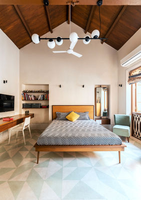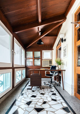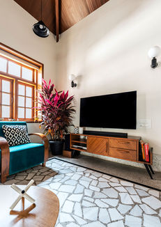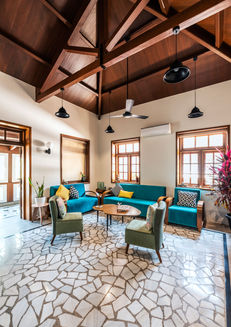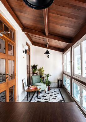 The expansive living room and the dining area are covered in white walls with 3 tall wooden openings to separate the balcony / the semi outdoor work from home space. The floor has a carpet of reclaimed broken marble from their previous flooring with terrazzo floor tiles on the sides and a foot high terrazzo skirting detail. Old Burma teak furniture and frames are used throughout the house to retain the vintage feel and complement the existing furniture pieces. The dining space has a 6 seater black glass table with a suspended chandelier on top and monochrome chairs with yellow piping details. The suede teal couch, green armchairs , colourful cushions and indoor plants together bring the pop of colour offsetting the overall monochromatic shell of the space.