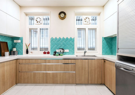 A long corridor with arched ceiling connects the main living space to the other 3 bedrooms and a kitchen at the rear end. We opened up the previously panelled windows to uncover the beautiful railing details and repainted it in white to enhance it's look against the teakwood frames.The kitchen was updated with a contemporary design in soft colors with plenty of storage, including a generously tall unit and an extendable breakfast bar detail. To add additional light to the space, we eliminated the storage on either sides of the two windows and added white back painted glass cabinets above the counter that blend in with the white walls throughout the kitchen.